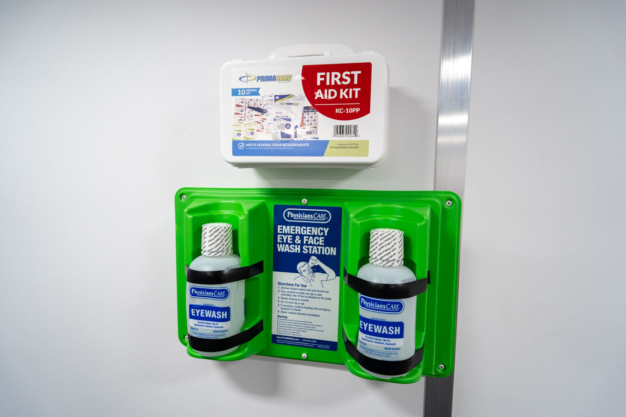 Eye Wash, First Aid Kit and Fire Extinguisher
