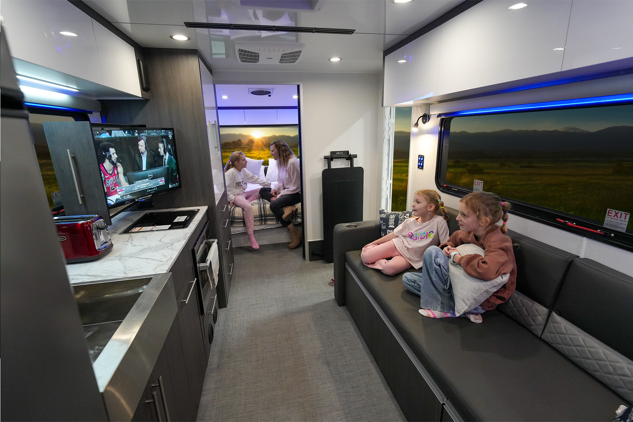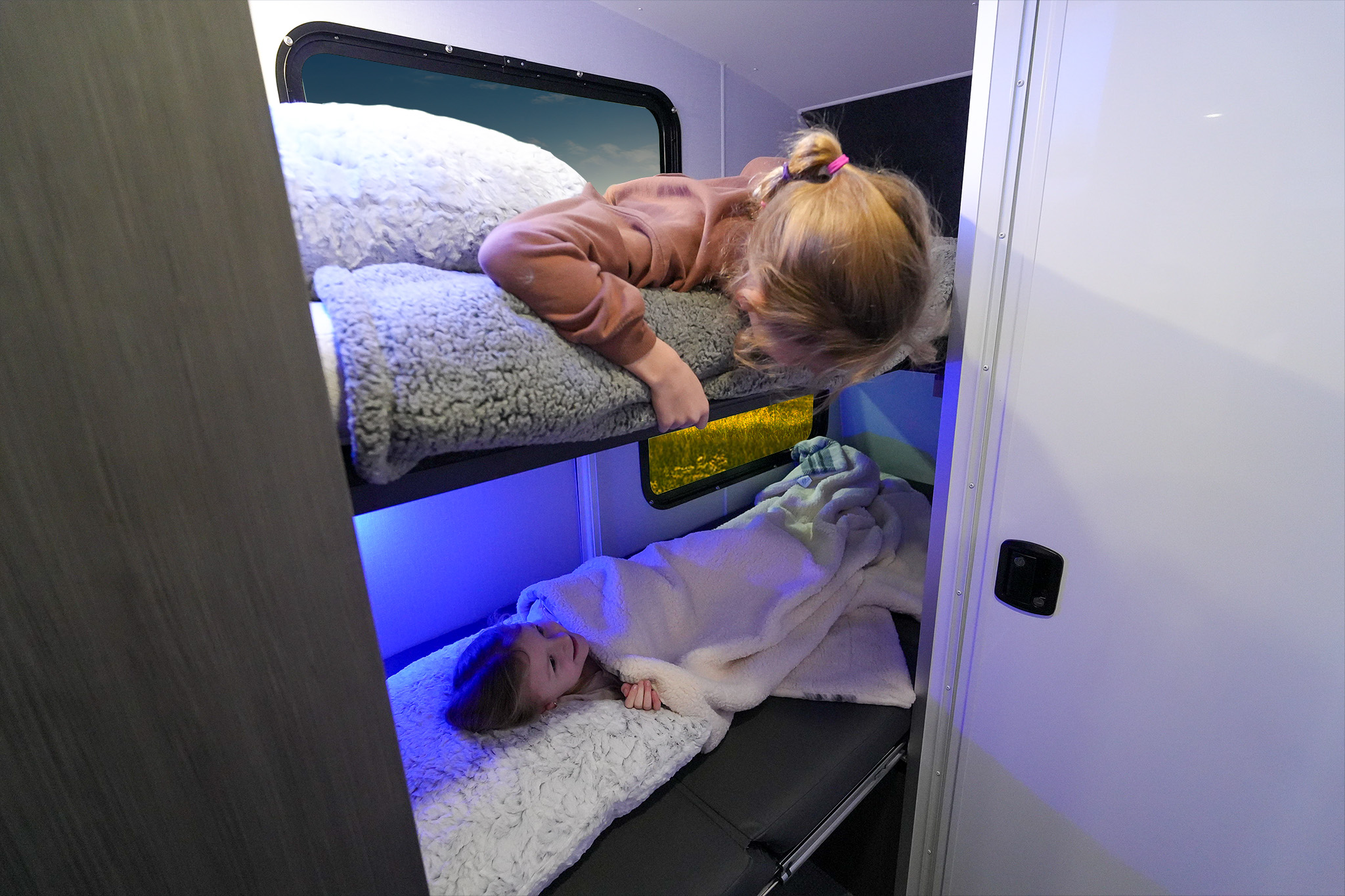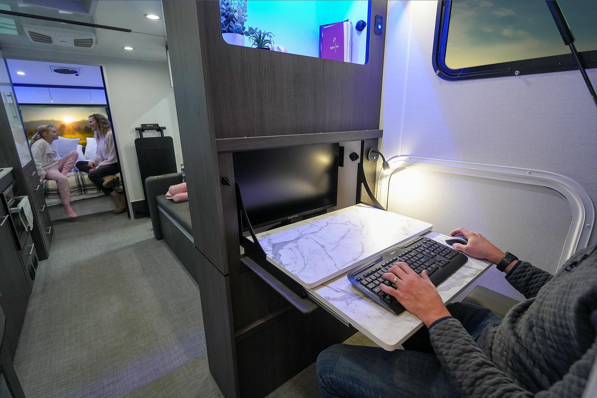 This first-of-its-kind RV features a transformational bunk area that easily converts into an office space, offering unmatched flexibility for family travel or work on the road. This innovative layout provides both, ensuring comfort and convenience for every adventure. This RV is built for families seeking a multi-use space that adapts to their lifestyle. Whether it's sleeping, working, or storing your essentials, this RV redefines family-friendly, multi-purpose travel.